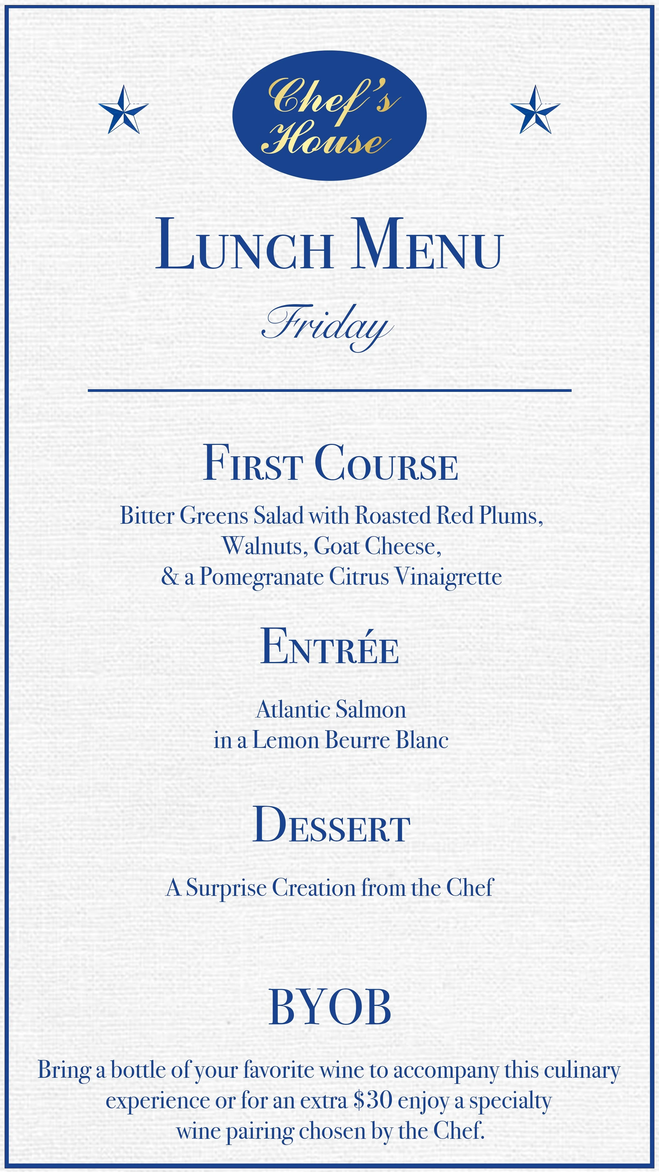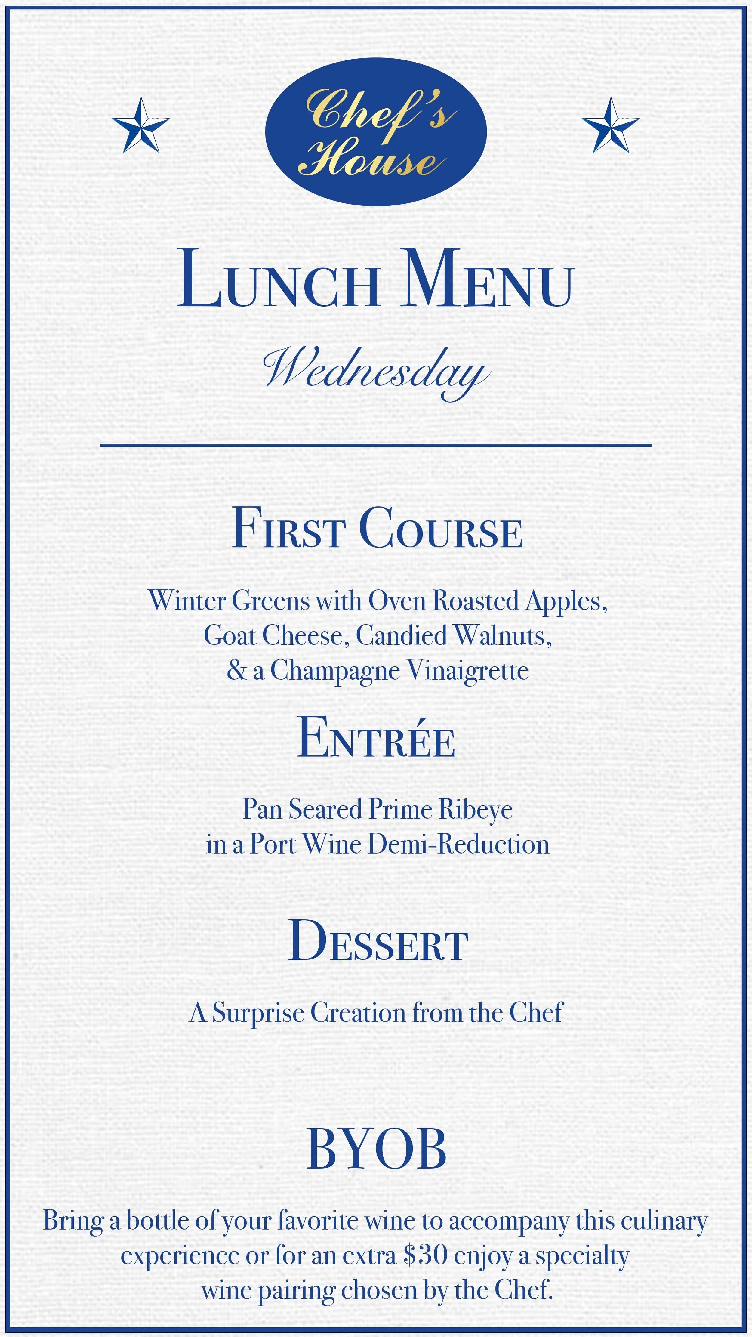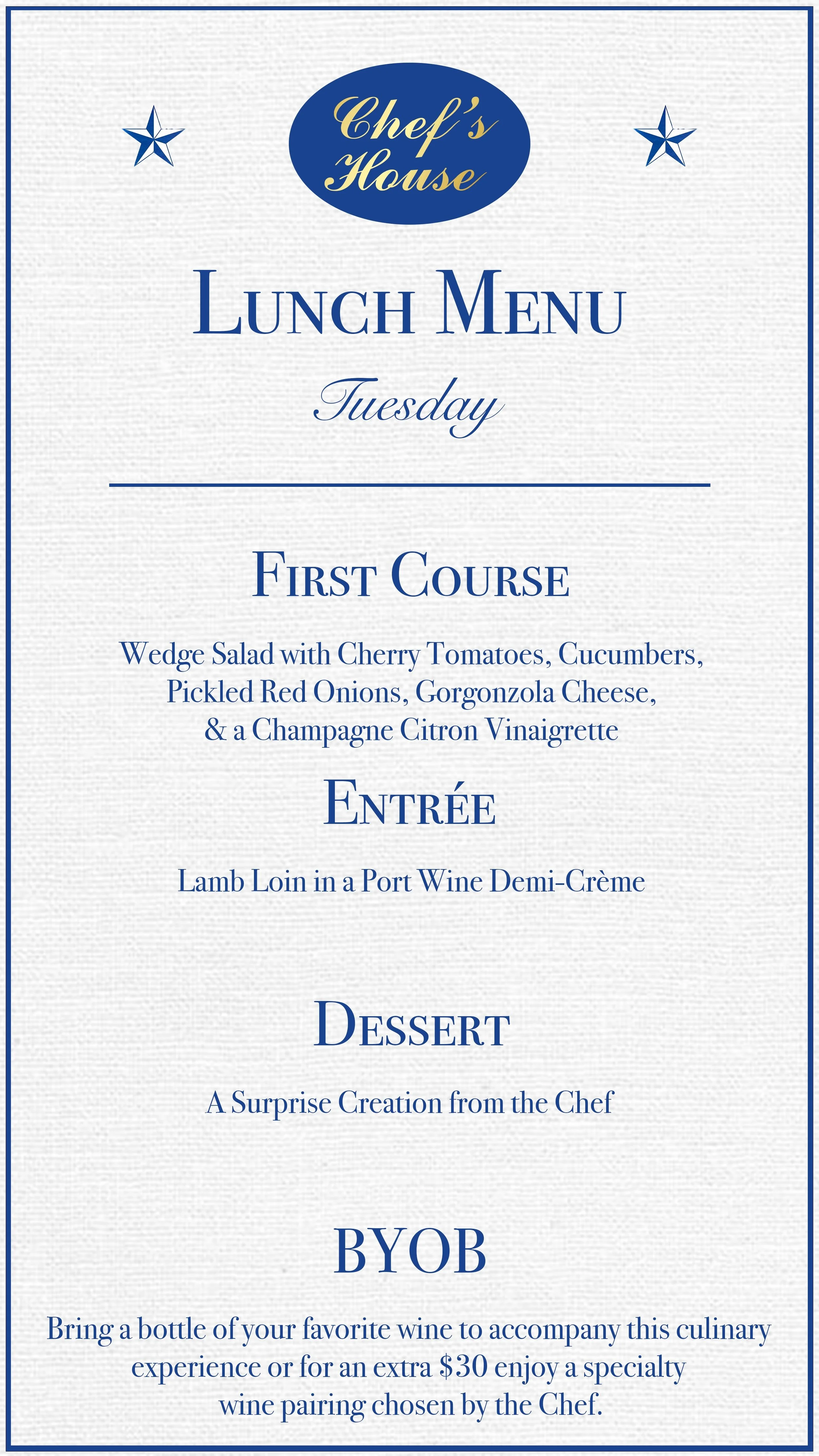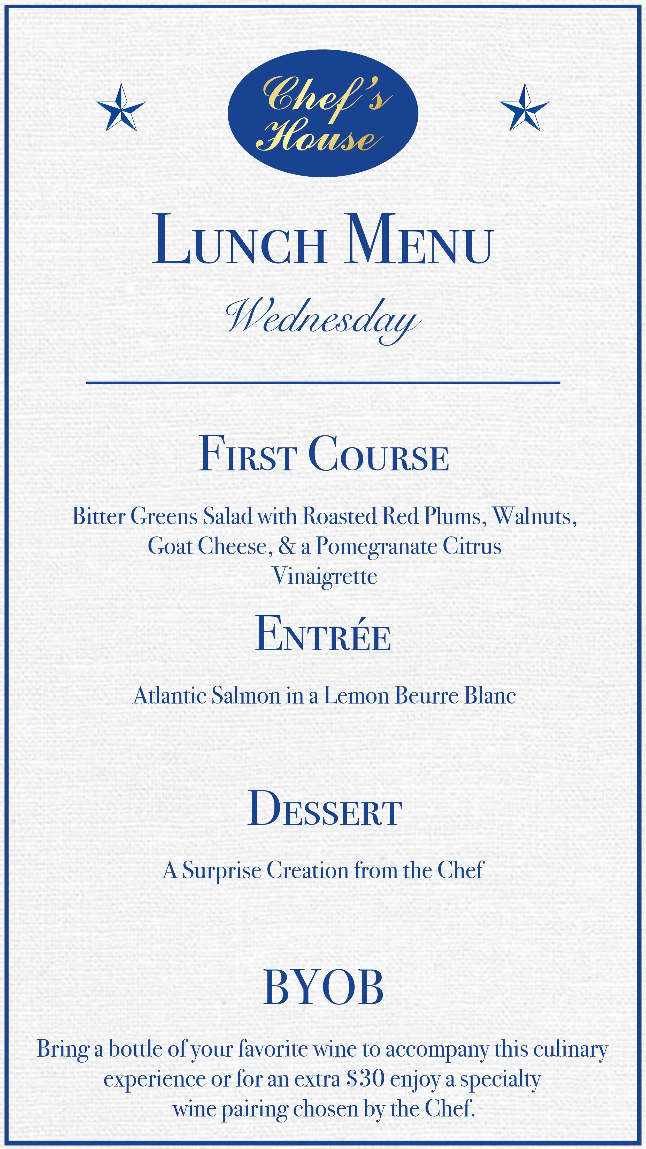 Today's Lunch Selection features the following courses. Please note, our menu changes daily to showcase the freshest seasonal ingredients.