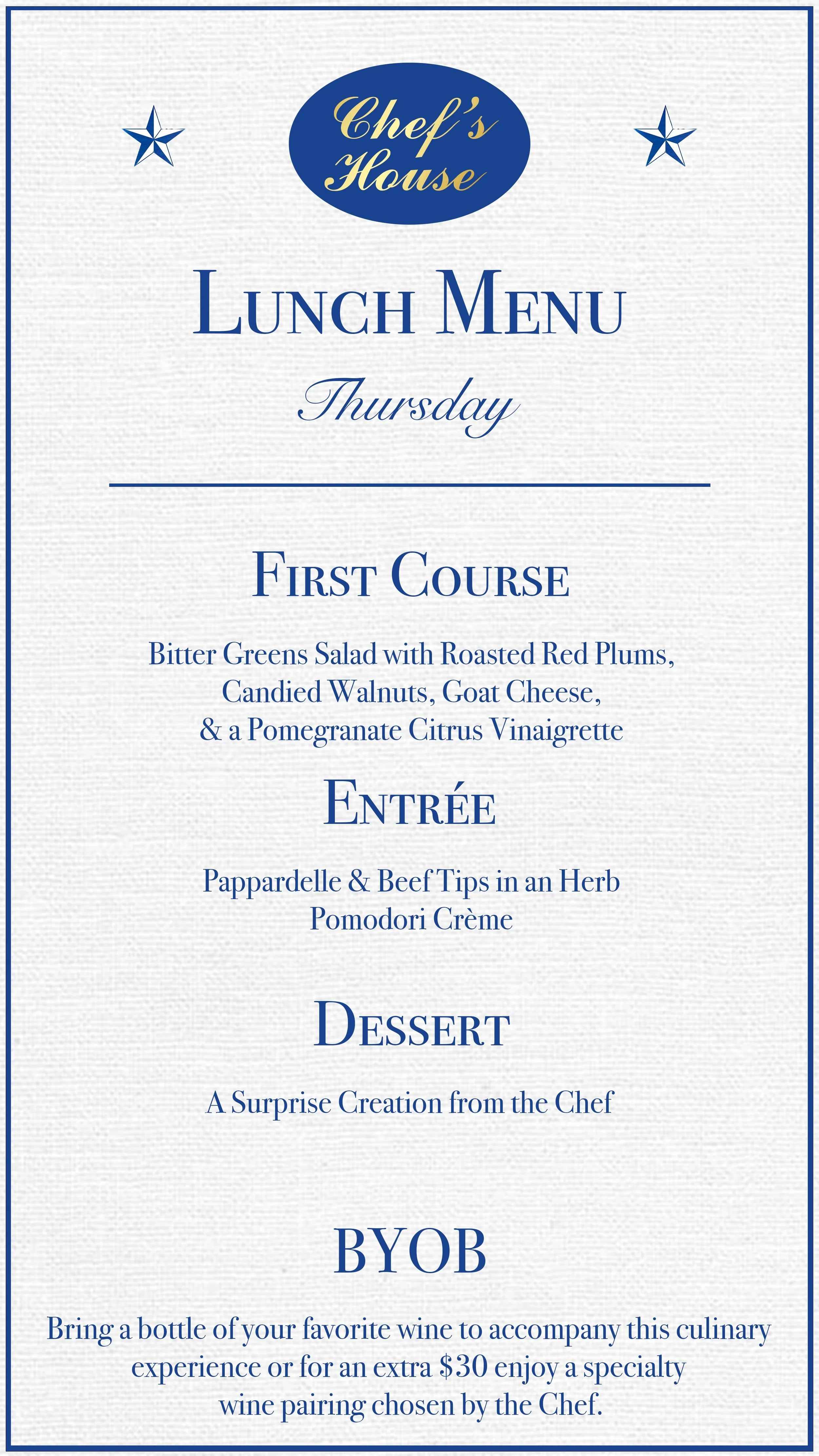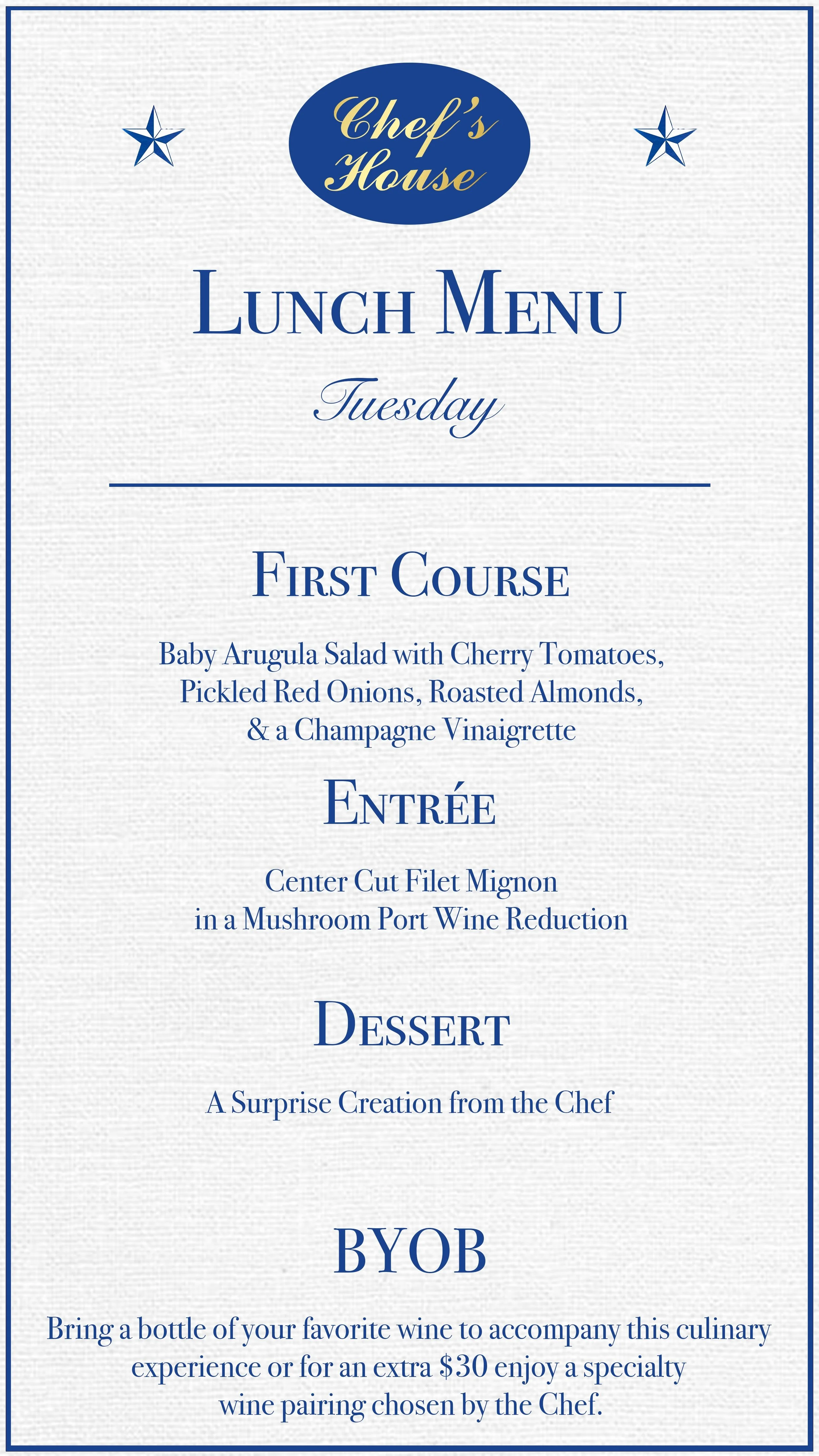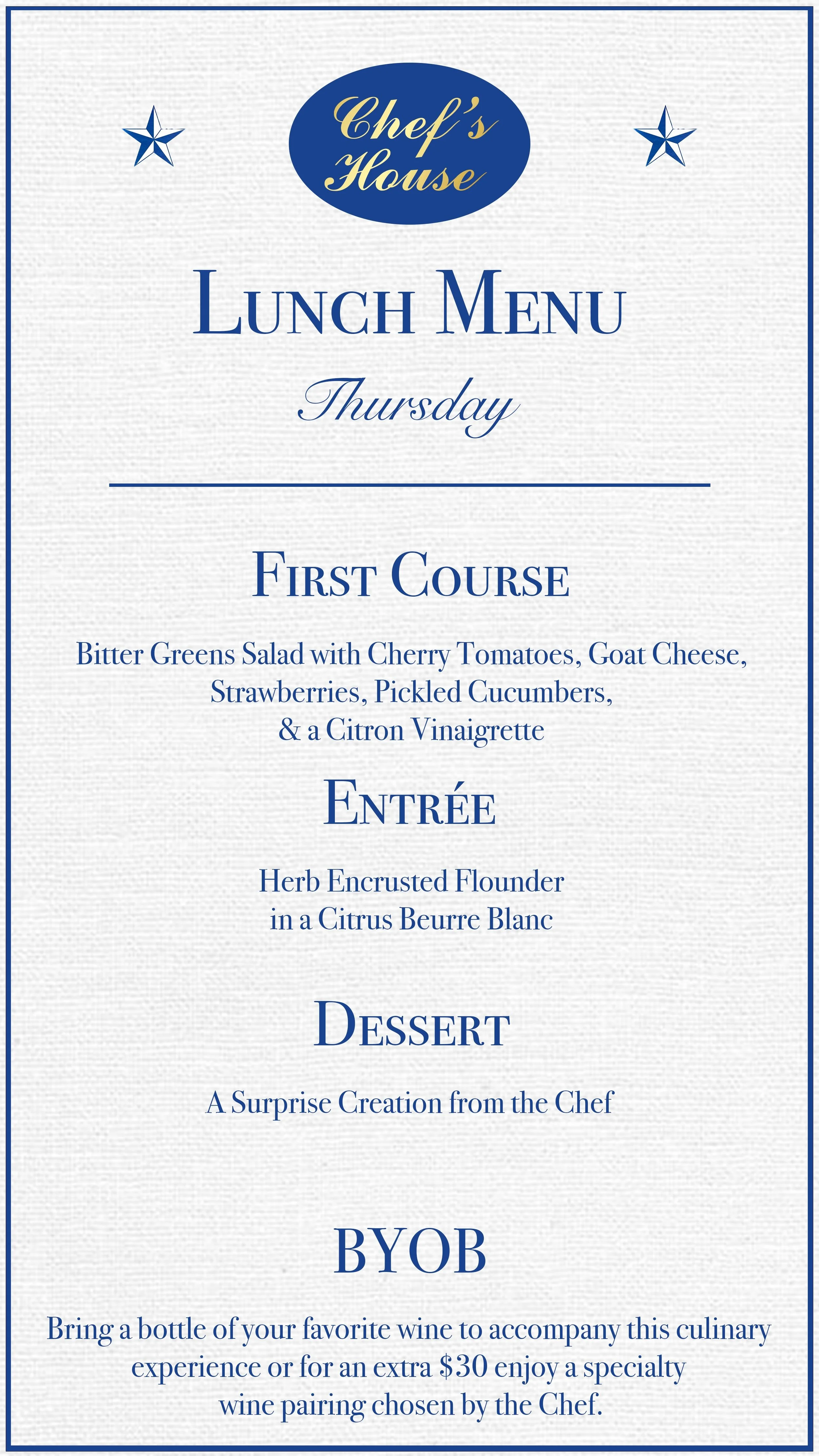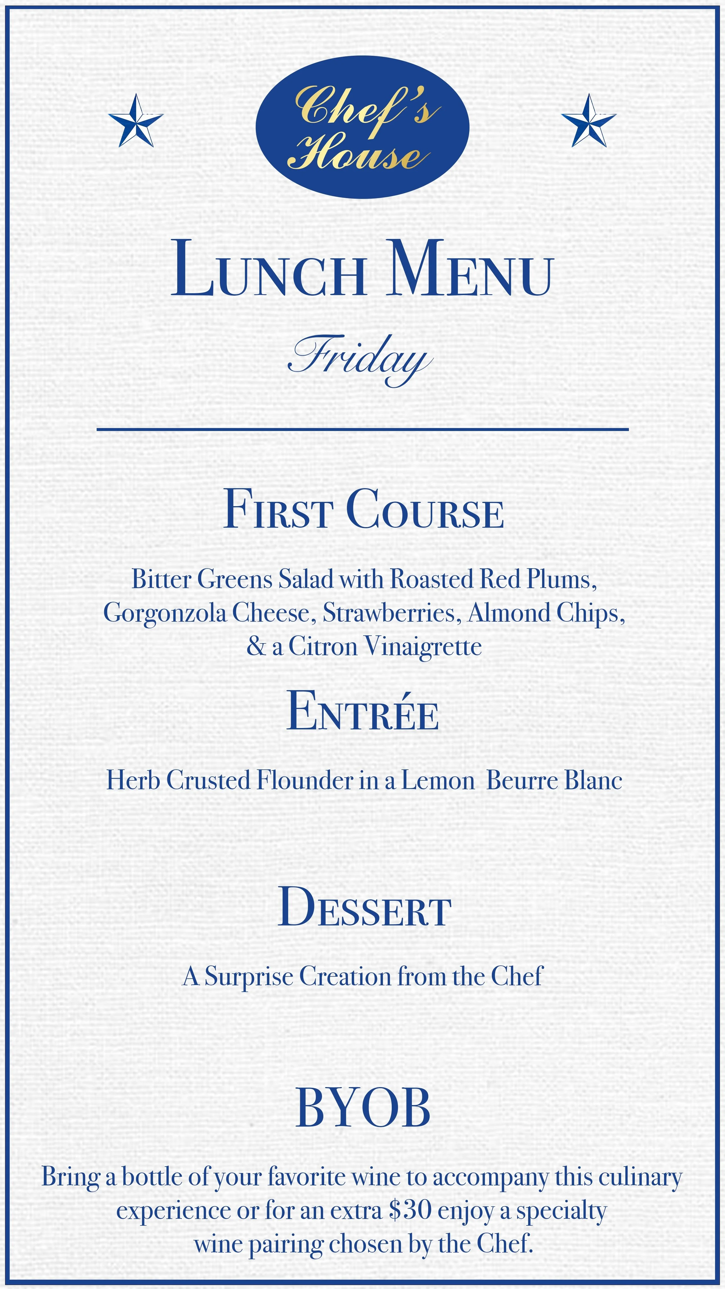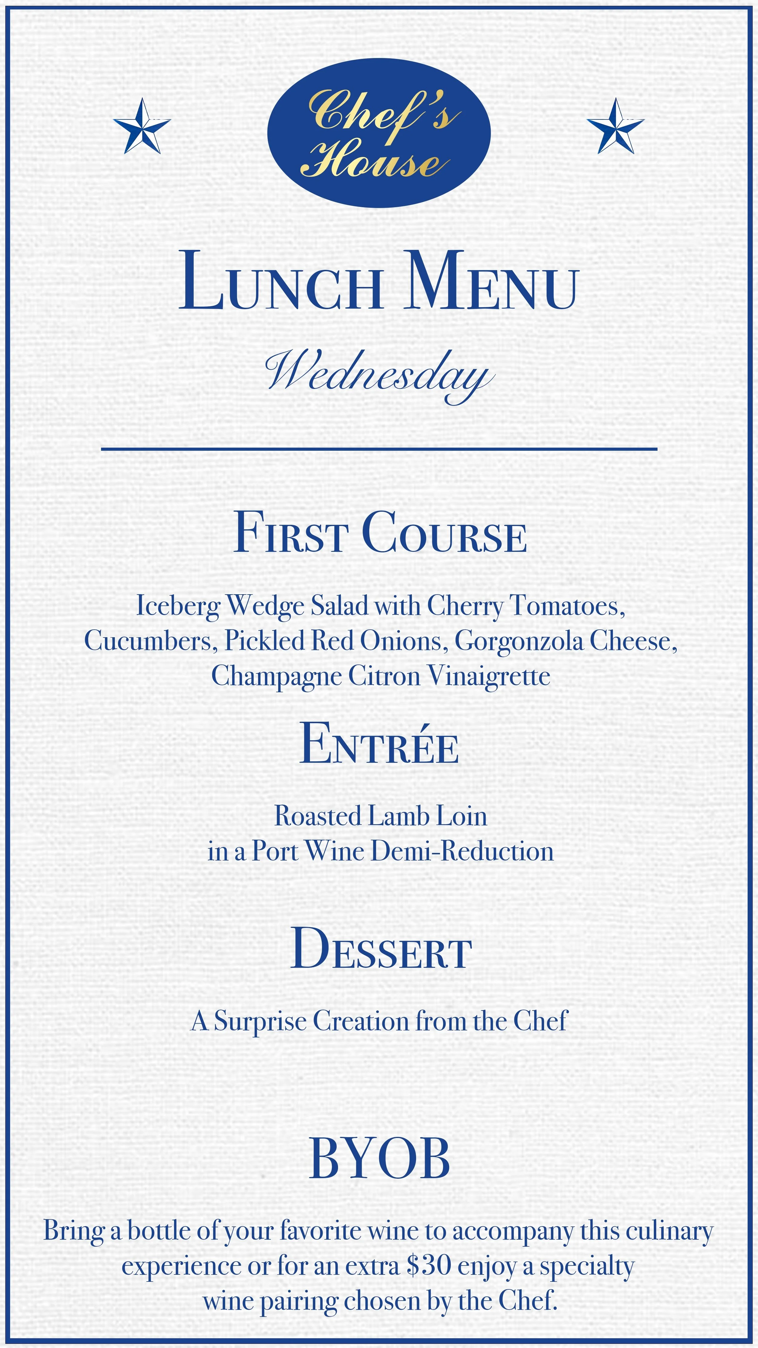 Today's Lunch Selection features the following courses. Please note, our menu changes daily to showcase the freshest seasonal ingredients.