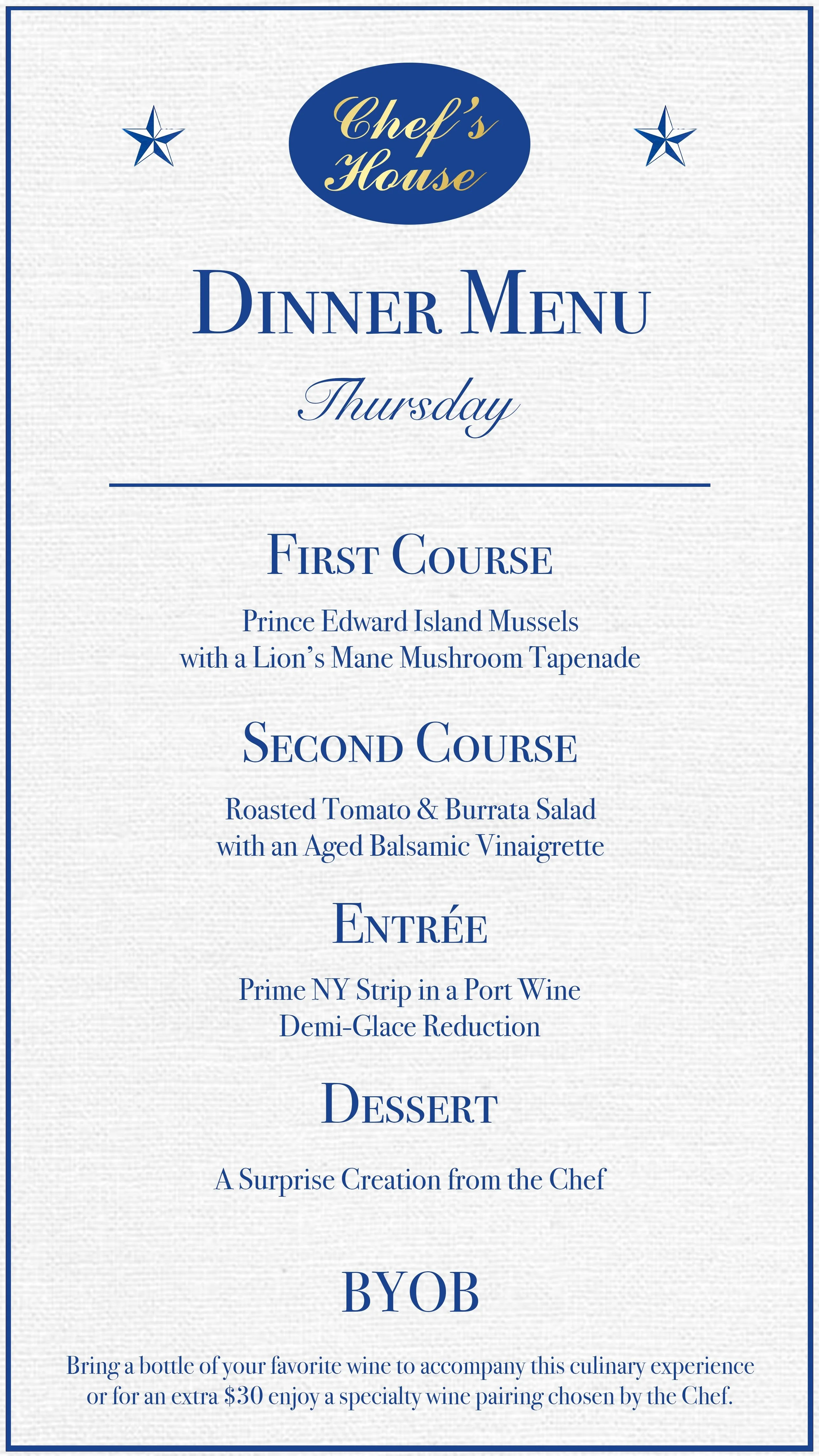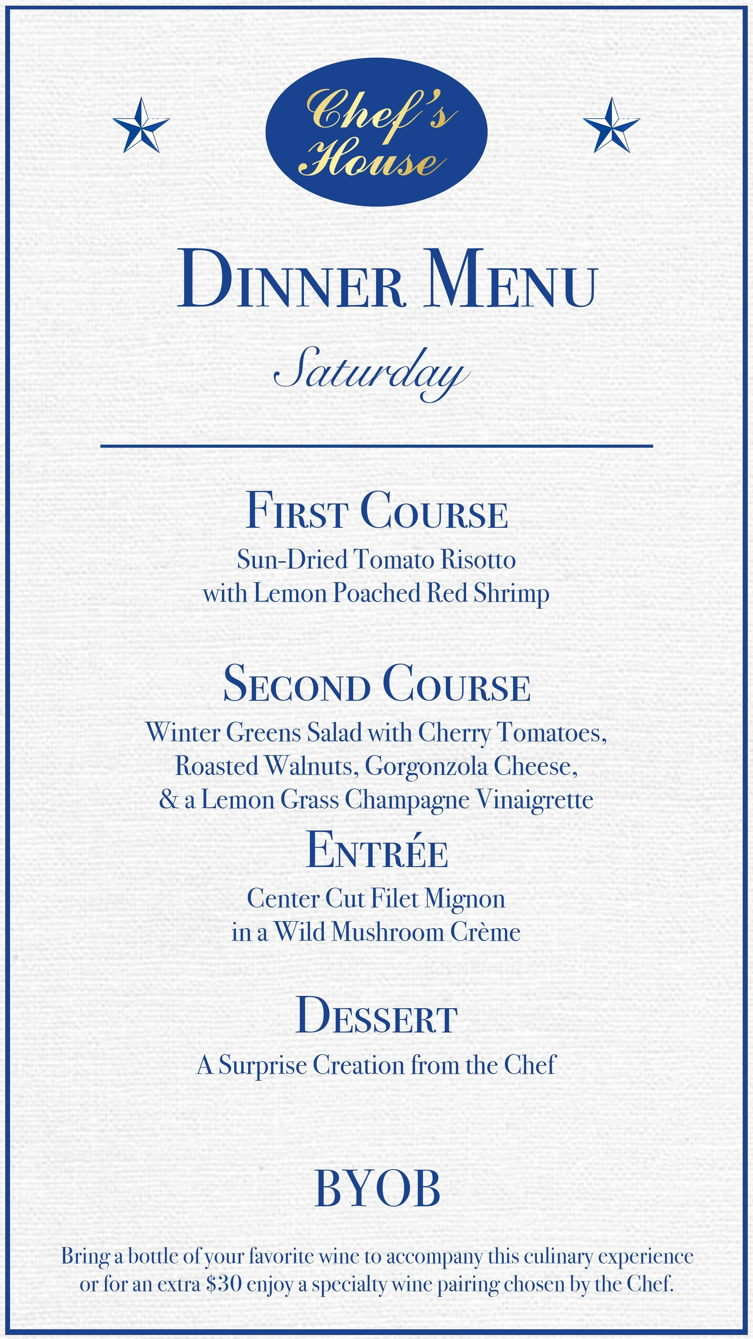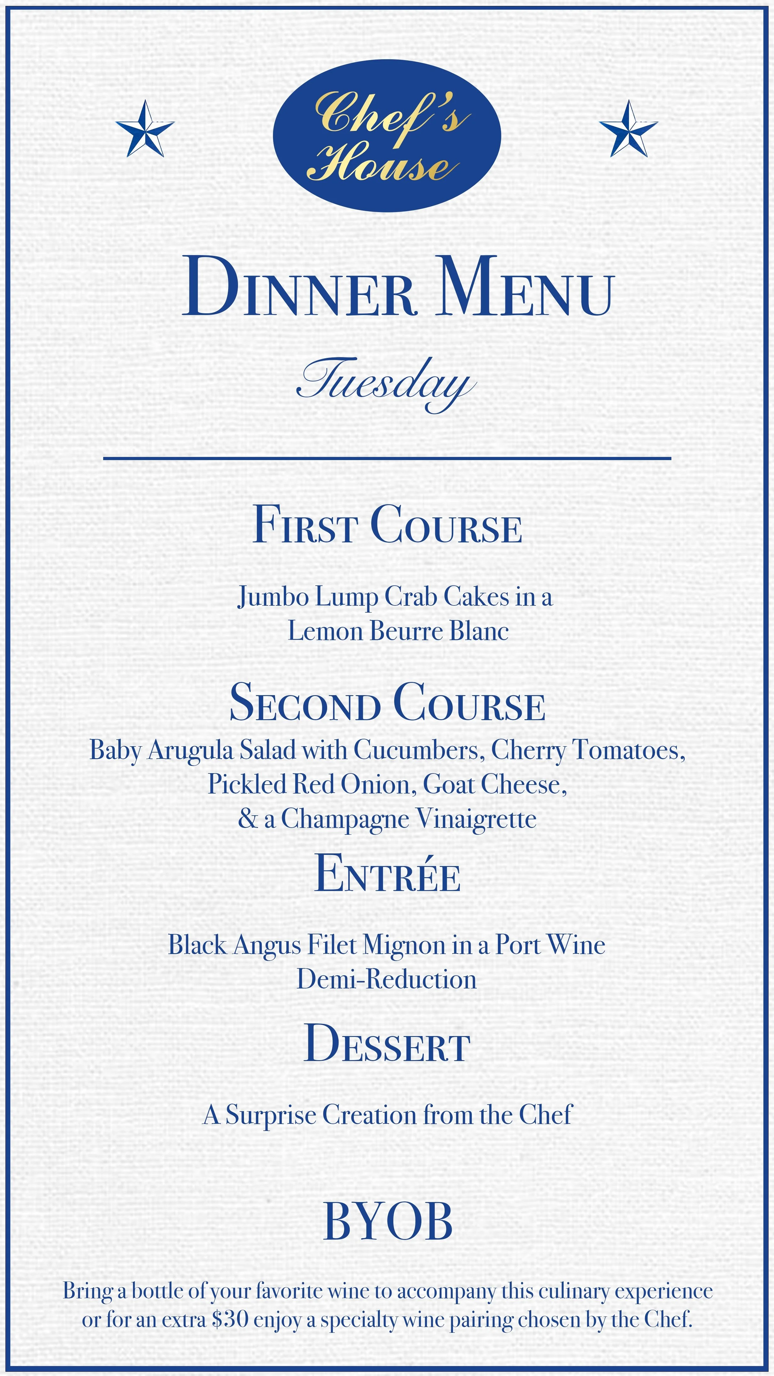 Today's Chef's Selection features the following courses. Please note, our menu changes daily to showcase the freshest seasonal ingredients.