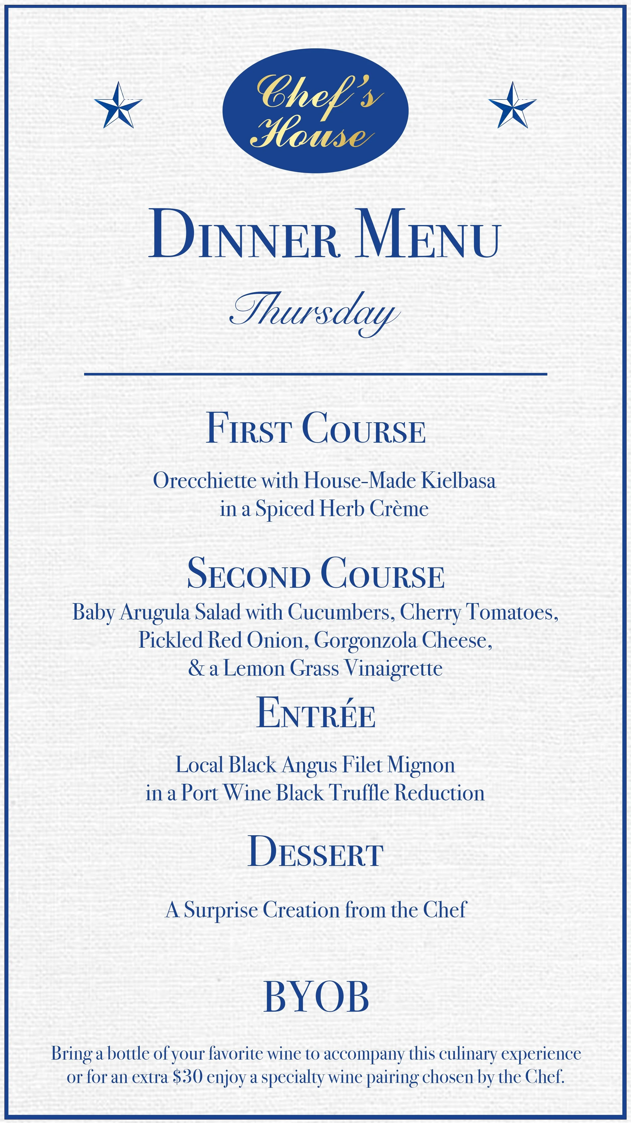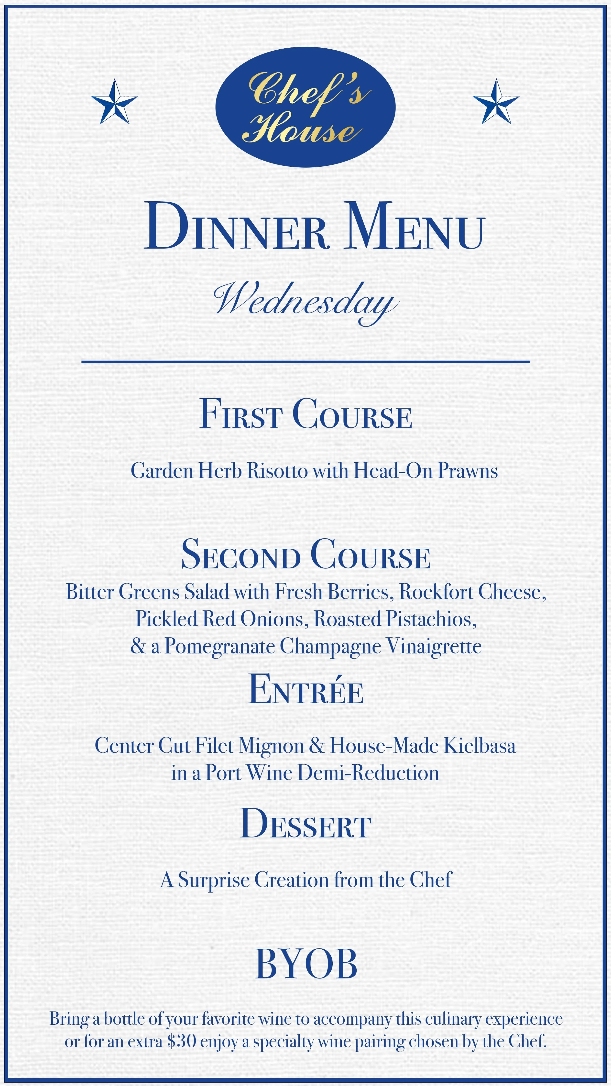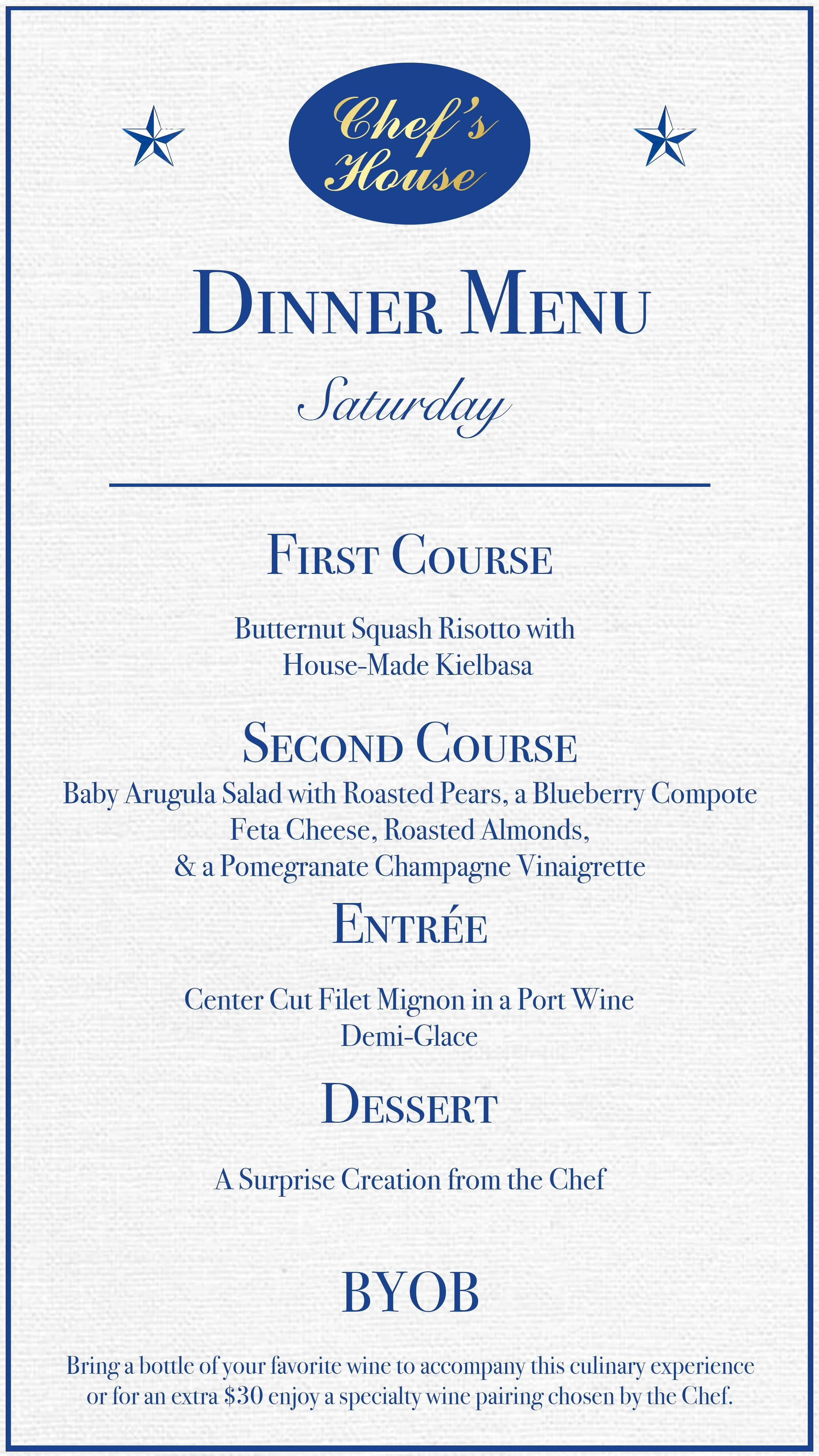 Today's Chef's Selection features the following courses. Please note, our menu changes daily to showcase the freshest seasonal ingredients.
